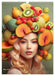 December: Brünette Frau trägt eine Kopfbedeckung aus vielen bunten Früchten