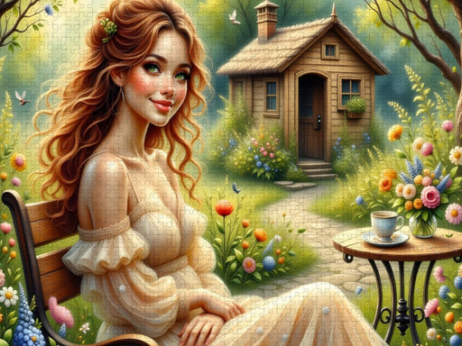 Eine junge Frau geniesst den Mai in ihrem kleinen Garten. Erleben Sie den friedvollen Frühling mit diesem zauberhaften Einzelbild „Sonnenglück im ...