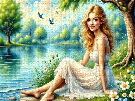 Eine Frau in einem luftigen weißen Kleid sitzt am Ufer eines glitzernden Sees, umgeben von grünen Bäumen und summenden Bienen. Erleben Sie die fri...