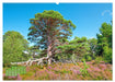 April: Uralte Kiefer mit freigelegten Wurzeln in blühender Heide, nach dem Gebirgszug Cairngorms benannter Nationalpark, Highlands, Schottland