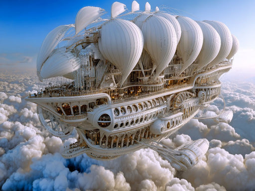 Fantastisches Luftschiff mit organischer Maschinerie Wie eine fliegende Kathedrale durchquert dieses Luftschiff die Wolken. Orgelpfeifen, Windkraf...