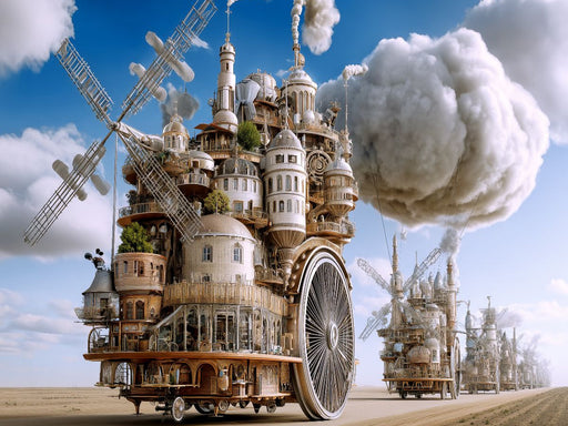 Windgetriebene Stadtmaschine auf großer Fahrt Eine phantastische Himmelsstadt auf mächtigen Rädern, die sanft über das Wolkenmeer rollt – angetrie...