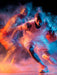 Dieses ausdrucksstarke Basketballmotiv fängt einen intensiven Moment des Spiels ein: Zwei Spieler im direkten Duell. Der Angreifer in voller Kontrolle des Balls, umhüllt von leuchtenden Farbwolken aus Blau und Orange. Die Szene wirkt wie eingefroren in einer Explosion aus Energie, Bewegung und Spannung. Die leuchtenden Partikeleffekte, kombiniert mit einer dynamischen Körperhaltung, machen das Bild zu einem visuellen Erlebnis voller Kraft und Emotion. Ein ideales Kunstwerk für Basketballfans, Sportbegeisterte und moderne Kunstliebhaber. Zwischen Realität und Vision: Diese Szene wurde mithilfe von KI und viel kreativer Energie erschaffen.