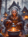 Baba Yaga ist eine alte, knochige Hexe mit langen, wirren Haaren, leuchtenden Augen und einer krummen Nase. Sie sitzt in ihrem fliegenden Mörser und hält ein hölzernes Rührpaddel, während sie durch einen dunklen, verwunschenen Wald schwebt. Ihr Hexenhaus, das auf riesigen Hühnerbeinen steht, ist im Hintergrund zu sehen, umgeben von Nebel und geisterhaften Lichtern.