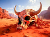 Auf einem zerklüfteten Felsplateau, umgeben von glühend roten Sanddünen, liegt ein verwitterter Riesenschädel, halb im Sand versunken. Die Knochen sind rissig und ausgetrocknet, vom heißen Wind gepeitscht, während Staubstürme über den Horizont ziehen. Am Schädel kleben noch rostige Überreste eines uralten Helms – ein letzter Hinweis auf eine verlorene Kriegerkultur.