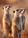 Drei Erdmännchen stehen aufrecht nebeneinander in der Savanne und schauen neugierig in die Ferne – ein einzigartiges Motiv voller Natürlichkeit.