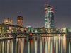 Die Frankfurter Skyline bei Nacht, die sich aus zahlreichen hohen, modernen Hochhäusern zusammensetzt. Den Anblick der beleuchteten Wolkenkratzer und Brücken kann man von verschiedenen Orten links und rechts des Mains aus genießen.