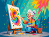 Dieses Bild aus Oma rockt den Ruhestand - Lustiger Frauenkalender mit Humor zeigt eine künstlerische Oma beim Malen. Ein farbenfrohes Motiv voller Kreativität, Humor und Inspiration – perfekt für Puzzle und Leinwand.