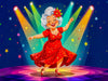 Eine fröhliche Oma tanzt im roten Kleid auf der Bühne, umgeben von buntem Scheinwerferlicht, voller Lebensfreude.