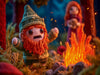 Rumpelstilzchen tanzt ums Feuer – geheimnisvoll, wild und voller Energie. Die KI-generierte Szene im Amigurumi-Stil besticht durch leuchtende Farben, kunstvolle Häkelstrukturen und ausdrucksstarke Mimik. Das fantasievolle Motiv bringt die Magie des Märchens eindrucksvoll zur Geltung – ein dekoratives Highlight mit Rätselcharme, das Kinder wie Erwachsene gleichermaßen begeistert.