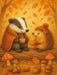 Ein Dachs und ein Igel genießen gemeinsam eine warme Tasse Tee unter Bäumen, umgeben von Herbstlaub und Pilzen. Diese liebevolle Szene in handgefilzter Wolloptik wurde KI-generiert und strahlt Ruhe, Freundschaft und Naturverbundenheit aus. Ideal für gemütliche Stunden – ob beim Puzzeln, Träumen oder Verschenken.