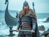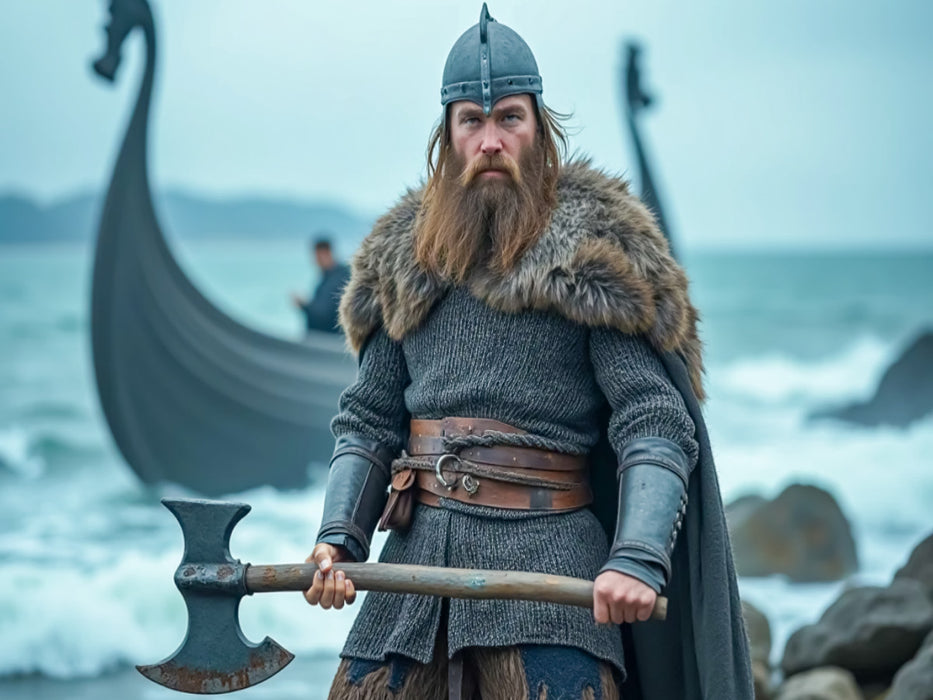 Ein bärtiger Wikingerkrieger steht auf einem felsigen Küstenstreifen, während hinter ihm ein Drachenboot im rauen Meer schwankt. Er trägt einen Kettenhemdpanzer, einen Fellumhang und einen einfachen, aber stabilen Eisenhelm ohne Visier. In seinen Händen hält er eine große Axt, und seine Augen funkeln wild und entschlossen.