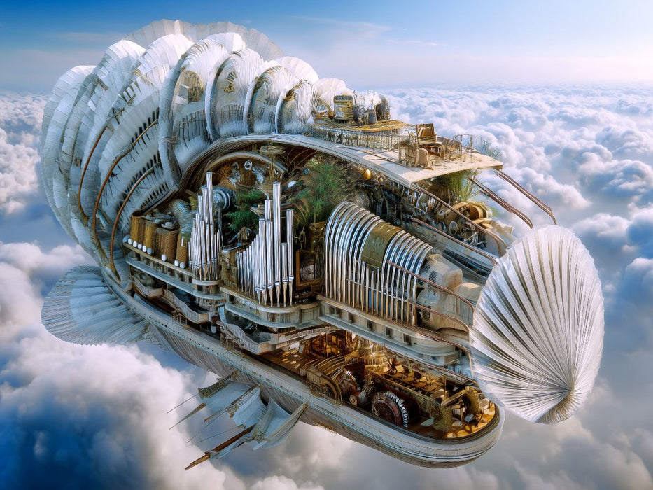 Wie eine fliegende Kathedrale durchquert dieses Luftschiff die Wolken. Orgelpfeifen, Windkraft und Maschinenästhetik verschmelzen zu einem faszinierenden KI-generierten Kunstwerk voller Symbolik und visionärer Kraft. Ein beeindruckendes Puzzle für alle, die innovative Kunst und fantastische Welten lieben.