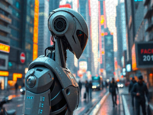 Erlebe die Zukunft in jedem Detail. Dieses hochwertige KI generierte Wandbild oder Puzzle zeigt einen humanoiden Roboter inmitten einer futuristi...