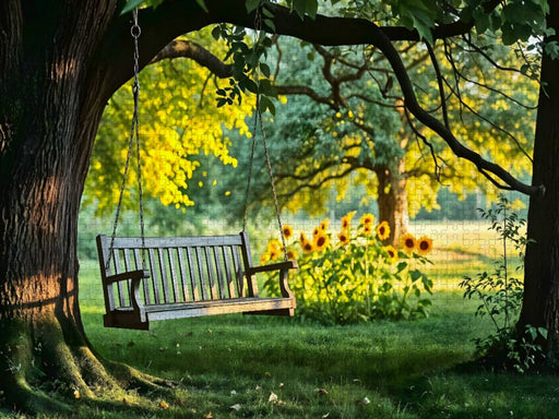 Ein Motiv aus dem Kalender Wo Gärten träumen - Verwunschene Rückzugsorte im Wandel der Jahreszeiten Eine alte Baumschaukel, verborgen im grünen Ga...