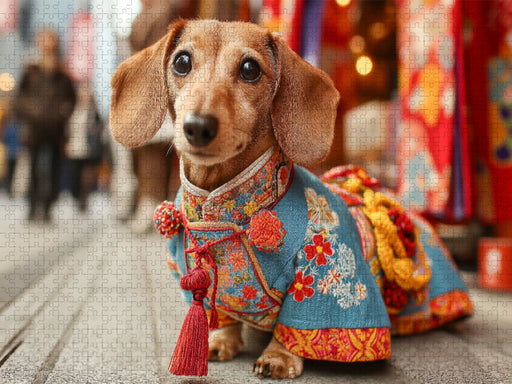Ein liebevoll gekleideter Dackel spaziert durch Tokio. Ideal für Puzzlefreunde, Japan-Fans und alle, die Hunde und besondere Reise-Motive lieben. ...