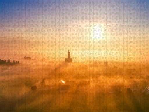 Der Kirchturm als stiller Zeiger der Sonne Aus erhöhter Perspektive zeigt sich das Dorf im Nebel, nur der Kirchturm bleibt sichtbar. Die aufgehend...