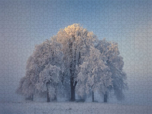 winterliche Baumgruppe an der Nebelgranze Im leisen Spiel von Nebel und Licht ragen die Bäume in den Wintermorgen. Ein sanfter Sonnenstrahl berühr...