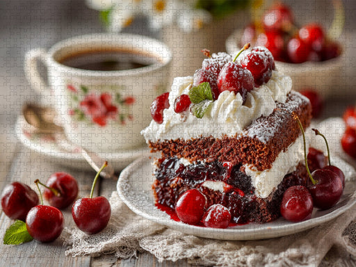 Vollständige Details anzeigenSchwarzwälder Kirschtorte Bild mit Kirschen und Kaffee - CALVENDO Foto-Puzzle'