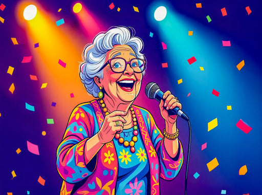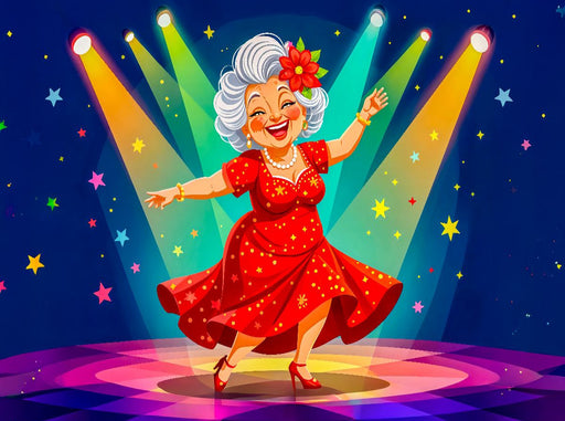 Eine fröhliche Oma tanzt im roten Kleid auf der Bühne, umgeben von buntem Scheinwerferlicht, voller Lebensfreude. Dieses humorvolle Motiv aus Oma ...