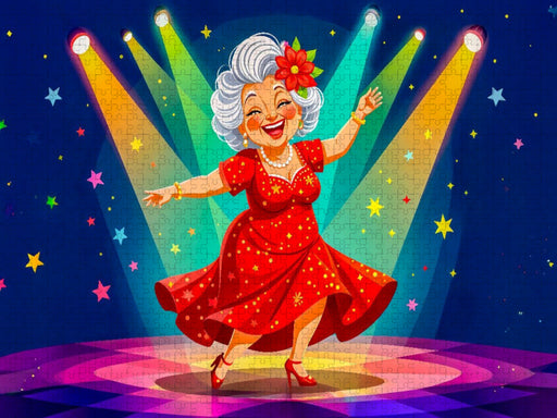 Vollständige Details anzeigenOma tanzt lachend im roten Kleid auf heller Bühne - CALVENDO Foto-Puzzle'