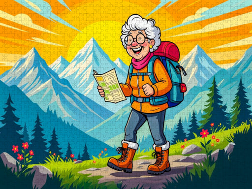 Vollständige Details anzeigenOma wandert fröhlich mit Rucksack durch sonnige Berglandschaft - CALVENDO Foto-Puzzle'