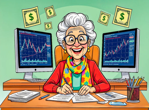 Eine schlaue Oma vor mehreren Bildschirmen, die erfolgreich am Aktienmarkt handelt. Das Motiv "Oma zockt am Aktienmarkt" aus dem Kalender "Oma roc...