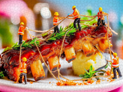 Vollständige Details anzeigenMiniatur Bauarbeiter erklimmen marinierte Rippchen mit frischem Rosmarin - CALVENDO Foto-Puzzle'