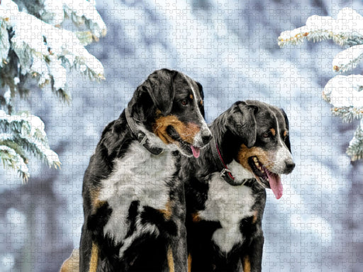 Appenzeller Sennenhunde Dieses beeindruckende Bild fängt die Harmonie und die natürliche Schönheit von zwei Appenzeller Sennenhunden in der maleri...