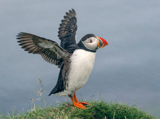 Ein Papageientaucher bereitet sich auf seinen Flug vor. Orkney ist eines der besten Orte um Puffins, auch Papageientaucher genannt, zu beobachten....