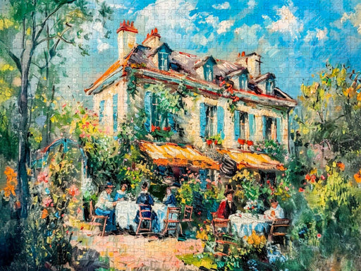 Vollständige Details anzeigenImpressionistische Villa mit Menschen im Garten an Tischen - CALVENDO Foto-Puzzle'