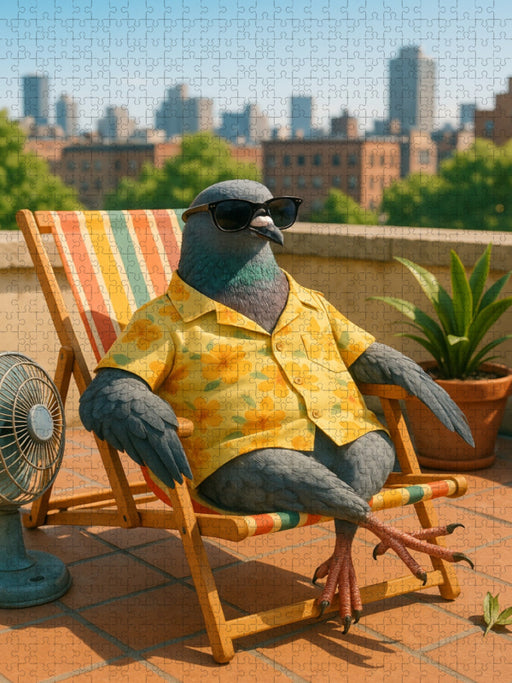 Sommer, Sonnenbrille, Schnabelpause. Eine Stadttaube im Hawaiihemd, entspannt im Liegestuhl, der Ventilator surrt – und irgendwo dahinter tobt die...
