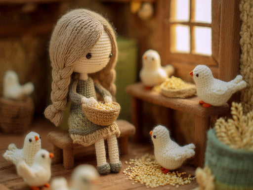 Amigurumi Märchenstunde nach den Gebrüdern Grimm Im Halbdunkel einer bescheidenen Stube sitzt Aschenputtel auf einem Hocker – umgeben von ihren Fr...