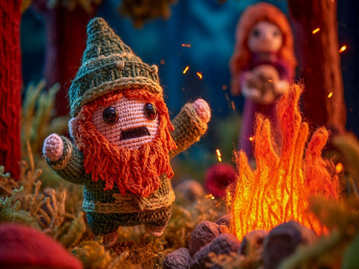 Amigurumi Märchenstunde nach den Gebrüdern Grimm Rumpelstilzchen tanzt ums Feuer – geheimnisvoll, wild und voller Energie. Die KI-generierte Szene...