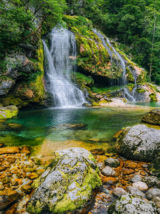 Ein Wasserfall wie aus einem Traum Eingebettet in moosbedeckte Felsen stürzt der Virje-Wasserfall in ein smaragdgrünes Becken – ruhig, klar und mä...