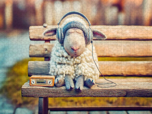 Vollständige Details anzeigenSchaf schläft mit Kopfhörern auf Parkbank - CALVENDO Foto-Puzzle'