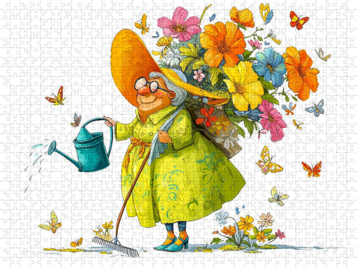 Vollständige Details anzeigenRentnerin mit Blumenstrauß und Gießkanne - CALVENDO Foto-Puzzle'