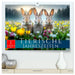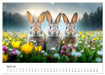 April: Drei Hasen genießen die ersten warmen Sonnenstrahlen auf einer bunten Blumenwiese
