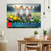 April: Drei Hasen genießen die ersten warmen Sonnenstrahlen auf einer bunten Blumenwiese