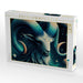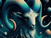 Ein Motiv für alle, die Struktur und Tiefe lieben: Der Steinbock mit leuchtendem Blick und spiralförmigen Hörnern, eingebettet in ein kosmisches Muster aus Wellen und Licht.
