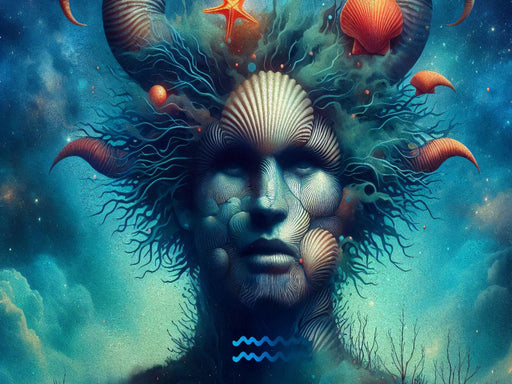 Sternzeichen Vision im Muschelgeist Ein Motiv für Freigeister: Der Wassermann als visionäre Figur mit muschelförmigem Kopf und fließendem Haar, um...
