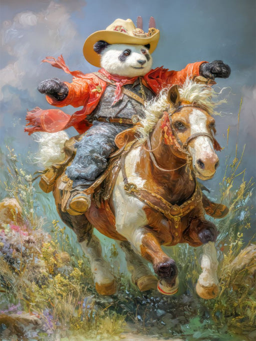 Ein Pandabär auf einem galoppierenden Pferd In unseren beeindruckenden KI-generierten Werken werden Pandas in anthropomorpher Gestalt gezeigt, die...