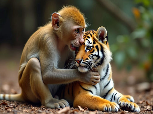 Ungewöhnliche Tierfreundschaft Eine außerwöhnliche tierische Verbindung hat dieser kleine Affe zu einem Tigerwelpen, der vermutlich seine Mutter v...