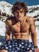 Ein heißer boy im Schnee mit Sixpack, nassem Oberkörper und Badehose. Die coole Pose, nackte Haut und sein durchtrainierter Körper machen dieses Motiv zu einem erotischen Highlight für alle, die sexy Männer lieben.