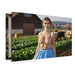 Eine sexy Frau zeigt sich nackt im Dirndl auf dem Feld, mit freiem Blick auf ihre Brüste. Der Bauernhof, die Kühe und die ländliche Umgebung machen das Motiv zum perfekten Highlight für Fans erotischer Landromantik.