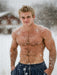 Ein heißer, oberkörperfreier Mann im Schnee. Sein definierter Körper, der nackt und verschneit im Winterlicht steht, sorgt für prickelnde Spannung.