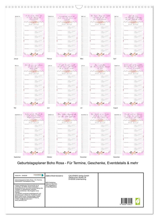View full detailsGeburtstagsplaner Boho Rosa - Für Termine, Geschenke, Eventdetails & mehr (CALVENDO Wandkalender 2026)
