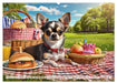 März: Chihuahua beim Picknick im Park auf einer karierten Decke und vollem Picknickkorb