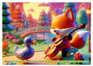 Februar: Fuchs und eine Ente, unzertrennliche Freunde, spielen gemeinsam eine Symphonie der Freundschaft