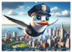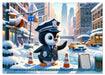 Januar: Wächter des Winters: Der Pinguin Polizeikommissar im verschneiten Stadtzentrum